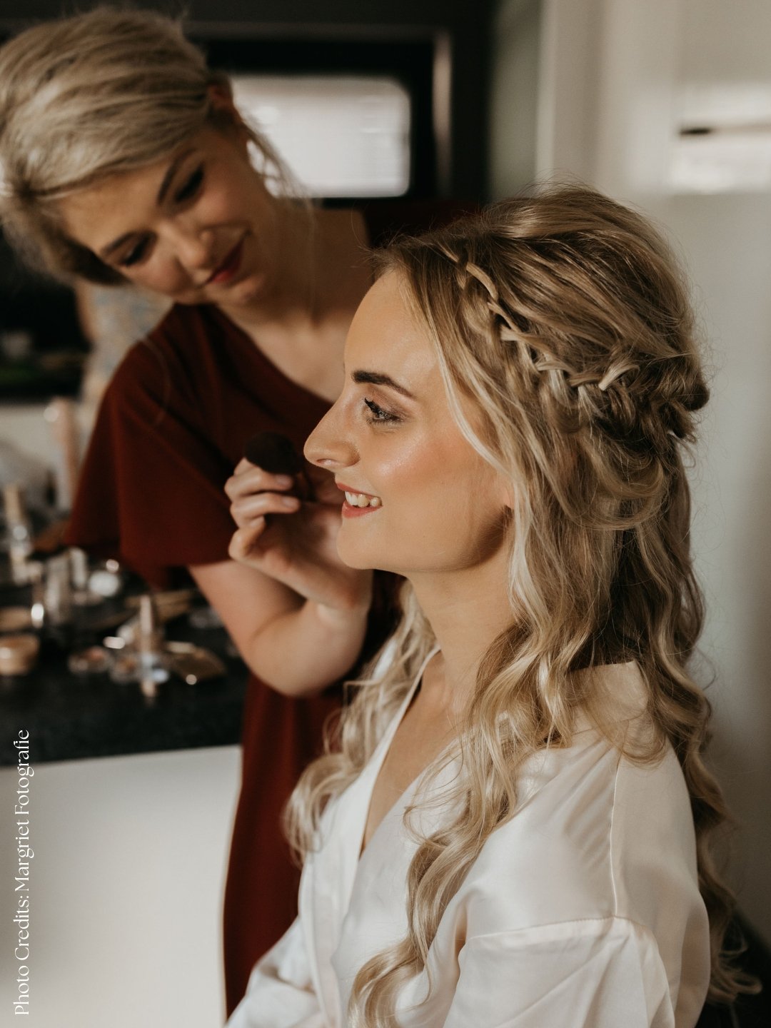 Stralende haar- en make-upstyling voor de bruid, verzorgd door stylistes met oog voor detail.Live-muziek & unieke bar